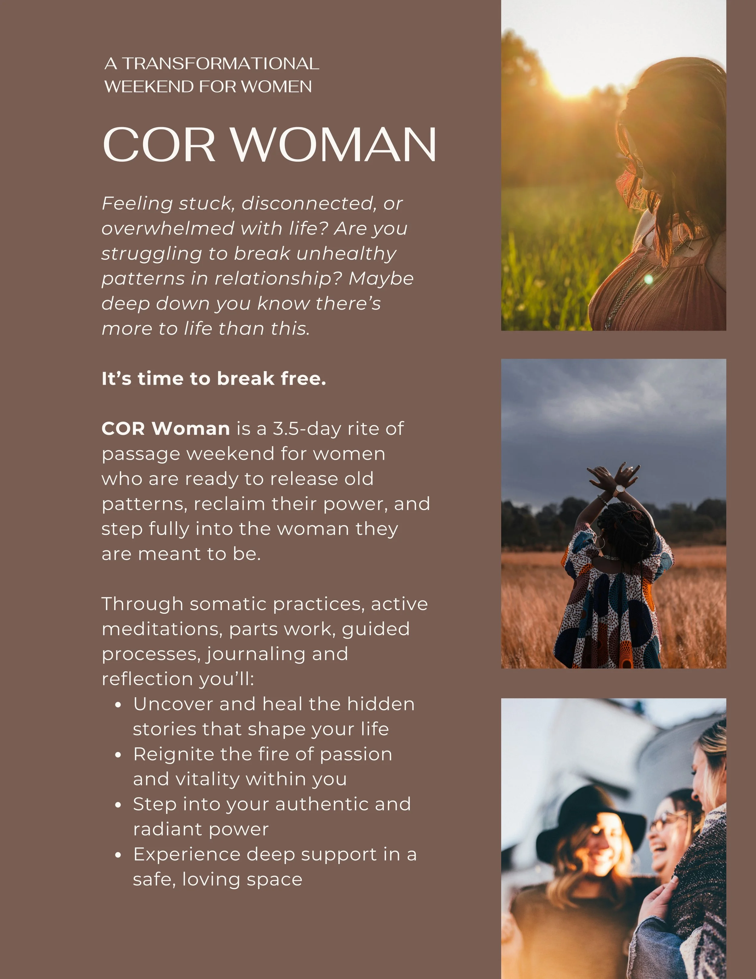 Below are a list of upcoming workshops that I am co-facilitating. If your heart feels called, please consider my warm invitation to step forward, to reclaim yourself, to come home. Reach out with any questions; I’m here to support you.